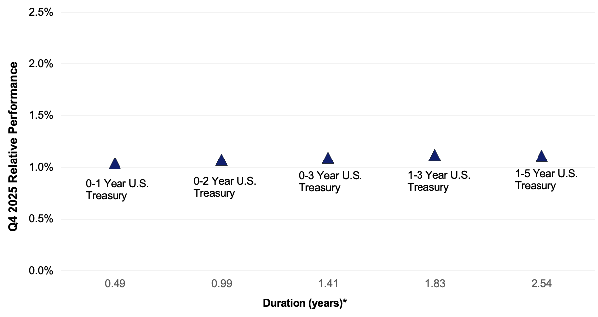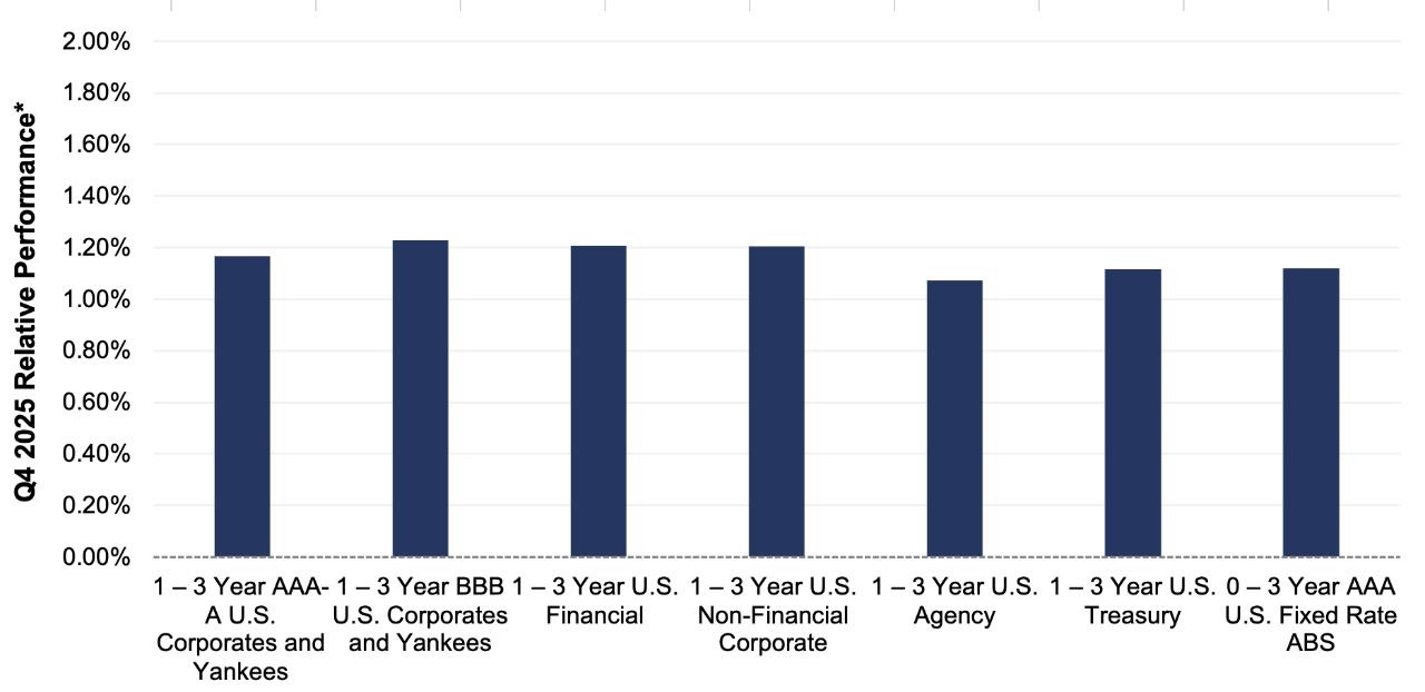Duration positioning, like the third quarter, did not meaningfully influence the performance of short duration mandates. Treasury indices with durations ranging from 0.5 to 2.5 years delivered returns within a narrow range over the period. Yields on front end maturities (1–3 years) declined as markets priced in additional Federal Reserve rate cuts, while yields in the intermediate segment of the curve (5–10 years) remained relatively stable. This steepening bias is expected to continue through 2026 based on current consensus forecasts. However, the anticipated shifts are projected to be more muted than the approximately 40 bps move between the 2 year and 10 year segments observed in 2025.