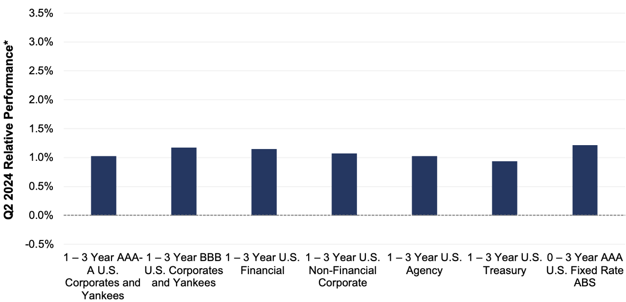 The three-month to five-year portion of the yield curve steepened 17.7 bps in the quarter as longer-end yields rose as Fed rate cut expectations were pushed out. There was a fair amount of yield volatility intra-month, with two-year yields peaking over 5.00% in late April, which provided an opportunity for portfolios to extend duration and lock in yields. The steepening yield curve benefitted portfolios with a shorter duration and a more bulleted structure with higher exposure to front-end positioning.