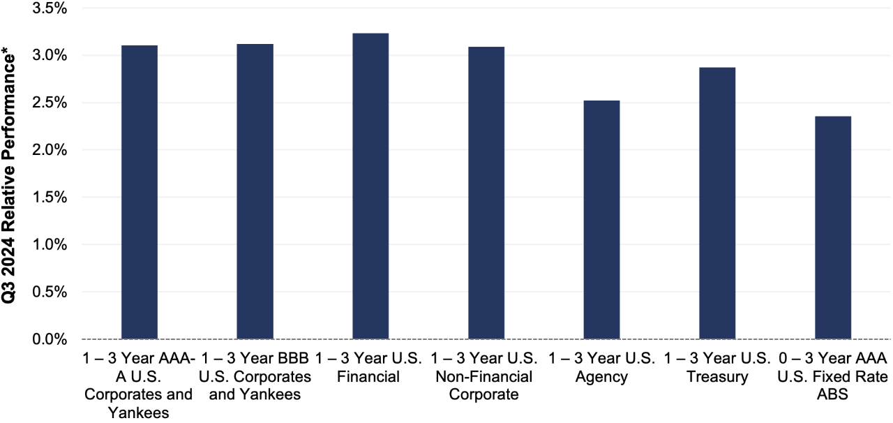U.S. financials outperformed non-financial corporate debt primarily due to its higher coupon advantage, as spreads for both sectors remained roughly unchanged. BBB credit outperformed AAA-A credit as demand for spread product and corporate debt remained strong in the quarter.